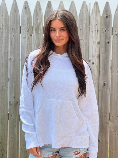 Long sleeve knit sweater with a hood and front pocket